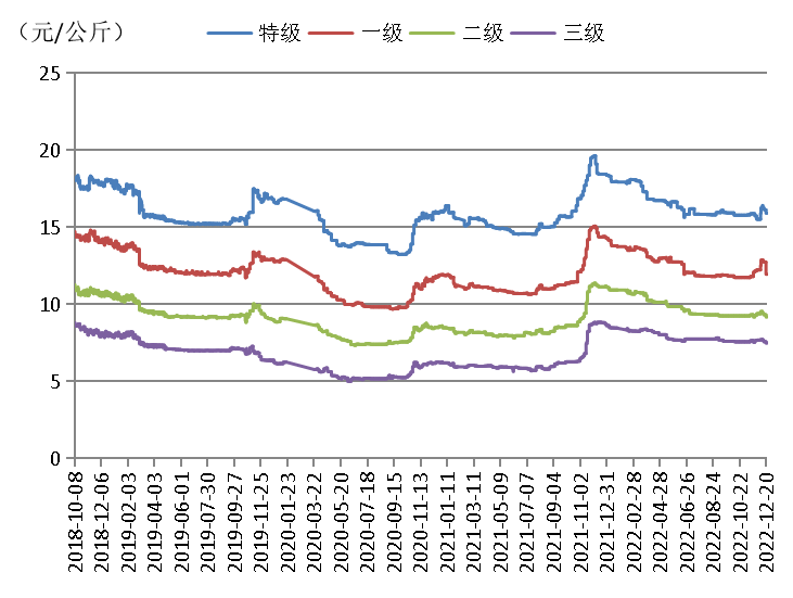 新疆产区方面,截至12月22日,与上周同期相比,特级、三级骏枣每公斤出货均价皆下跌0.13元;各等级灰枣每公斤出货均价分别下跌0.14元至0.79元不等。调研显示,因下游走货规模有限,产区红枣收购及加工销售不及预期,红枣价格随市场下调,临近春节,目前产区企业挺价意愿减弱。未来短期,新疆产区红枣价格或将稳中有降。
