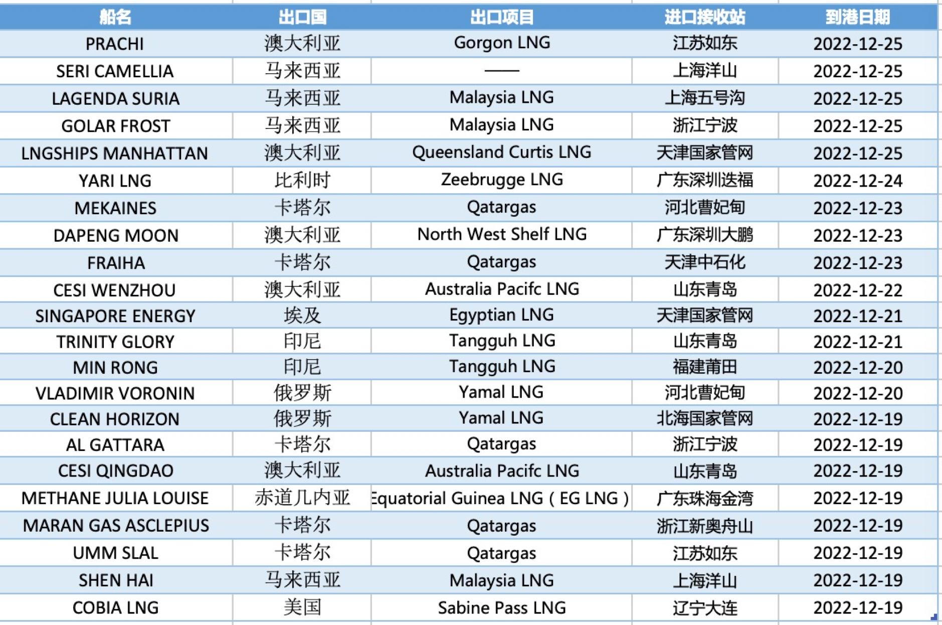 E-Gas系统:12月19日-25日当周中国LNG进口量约162万吨