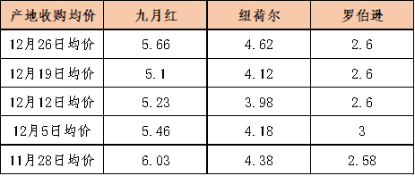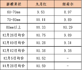 消费端需求大涨,带动了秭归脐橙价格上升。截至12月26日,秭归九月红产地收购均价报5.66元/公斤,环比上涨10.93%,同比上涨0.27%;纽荷尔产地收购均价报4.62元/公斤,环比上涨12.18%,同比上涨36.06%;罗伯逊产地收购均价报2.6元/公斤,环比持平,同比上涨0.89%。
