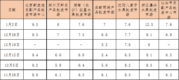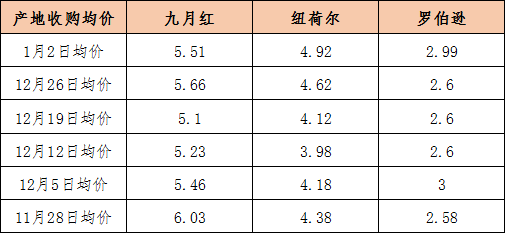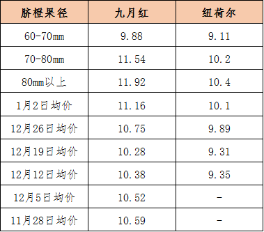 价格方面,截至1月2日,秭归九月红产地收购均价报5.51元/公斤,环比下跌2.55%,同比下跌2.29%;纽荷尔产地收购均价报4.92元/公斤,环比上涨6.5%,同比上涨38.09%;罗伯逊产地收购均价报2.99元/公斤,环比上涨14.98%。