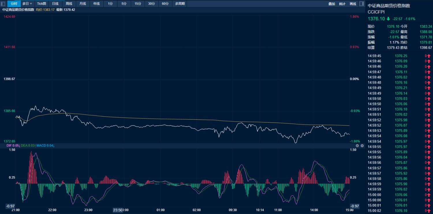 截至5日下午收盘时,中证商品期货价格指数收报1376.10点,较前一交易日下跌22.57点,跌幅1.61%。