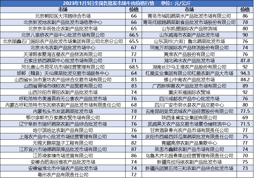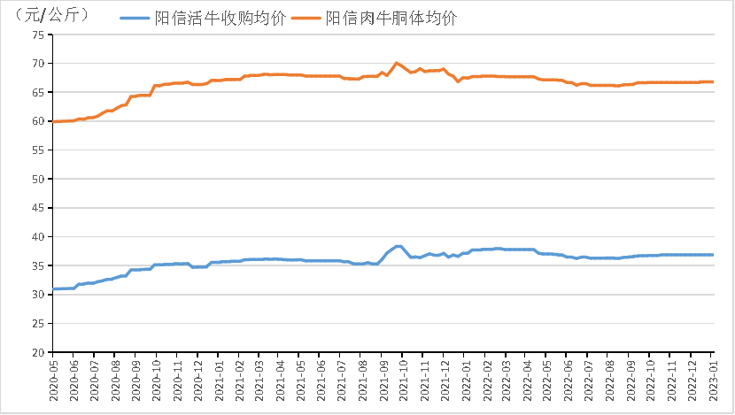 具体价格方面,截至2023年1月2日,阳信活牛收购均价报36.88元/公斤,环比上涨0.01元/公斤;肉牛胴体均价报66.92元/公斤,环比上涨0.23元/公斤。