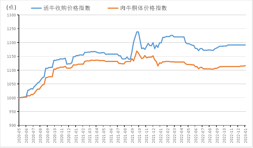 截至2023年1月2日,阳信活牛收购价格指数报1191.53点,环比(2022年12月5日,下同)上涨0.02%;阳信肉牛胴体价格指数报1116.92点,环比上涨0.34%。