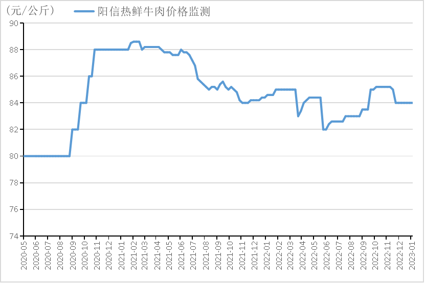 阳信热鲜牛肉价格监测数据显示,截至2023年1月2日,阳信热鲜牛肉价格报84元/公斤,环比持平。