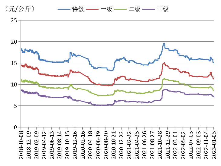 新疆产区方面,截至1月5日,与上周同期相比,一级、二级、三级骏枣每公斤出货均价分别上涨0.36元至0.56元不等;各等级灰枣每公斤出货均价分别下跌0.03元至0.27元不等。调研显示,元旦期间,北方市场对骏枣需求增加,带动骏枣走货量短期上行,当前已回归平稳,骏枣价格趁势上调。灰枣原料成本收购价格有所下跌,考虑到物流运输即将暂停,企业下调售价促进销售。未来短期,红枣价格或将承压下行。
