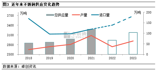 预计2023年中国不锈钢产量或上升至2917万吨左右,增幅在6.52%。主要考虑到新增产能的继续释放,以及前期投产的企业进一步达产,带动产量开始上升。另外随着粗钢压减工作影响进一步减弱,钢厂整体生产负荷预期有所上升。另外随着国内企业域外建厂后的低成本资源进一步回流国内,预计2023年中国不锈钢进口量上升至182万吨左右。受此影响全年供应量或上升8.01%,对不锈钢市场价格或形成一定拖累。