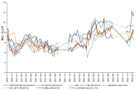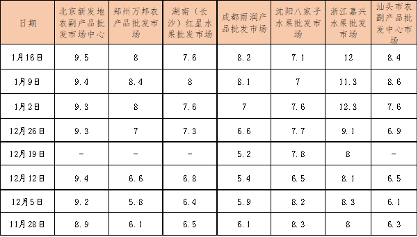 在前期价格持续上涨基础上,本期新华指数农业市场研究中心重点监测的七大批发市场脐橙销售价格较为平稳。其中北京新发地农副产品批发市场中心本期脐橙批发均价为9.5元/公斤,郑州万邦农产品批发市场本期脐橙批发均价为8元/公斤,汕头市农副产品批发中心市场本期脐橙批发均价为8.4元/公斤。