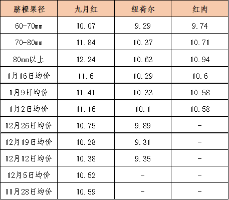 在脐橙产地收购方面,秭归九月红脐橙即将下市,秭归红肉脐橙逐步大批量上市。春节前夕,客商备货积极,秭归脐橙产地收购市场行情走俏。价格方面,当前市面上秭归九月红脐橙大果基本走完,受干旱天气影响,本产季九月红脐橙尾货小果居多,果农基本顺价销售。截至1月16日,九月红脐橙产地收购均价报5.17元/公斤,环比下跌2.36%,同比下跌5.33%。而同期秭归红肉脐橙产地收购均价报4.85元/公斤,环比下跌3.00%,同比上涨22.34%;纽荷尔脐橙产地收购均价报5.19元/公斤,环比下跌1.45%,同比上涨34.8%;罗伯逊产地收购均价报3.08元/公斤,环比上涨8.14%。