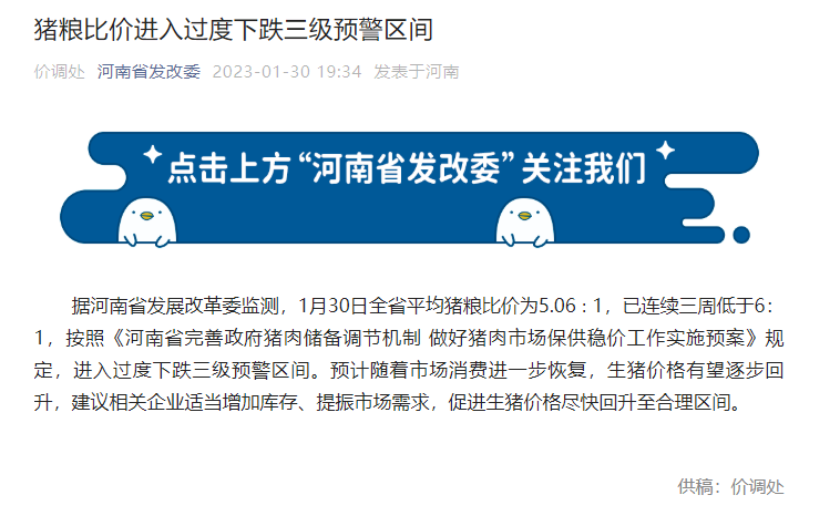 据河南省发展改革委监测,1月30日全省平均猪粮比价为5.06∶1,已连续三周低于6:1,进入过度下跌三级预警区间。预计随着市场消费进一步恢复,生猪价格有望逐步回升。