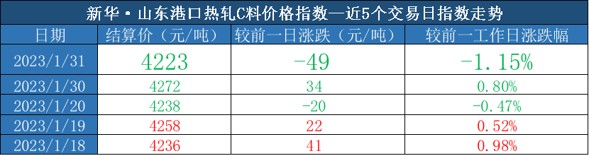 截至2023年1月31日,新华·山东港口热轧C料价格指数报4223元/吨,较前一交易日下跌49元/吨,跌幅1.15%。