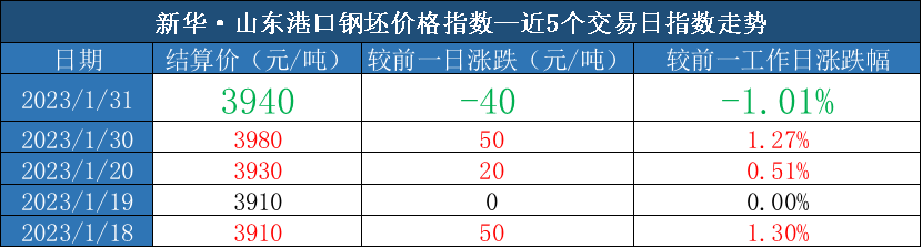 新华财经北京1月31日电(吕世阔) 截至2023年1月31日,新华·山东港口钢坯价格指数报3940元/吨,较前一交易日下跌40元/吨,跌幅1.01%。