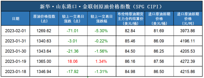 新华财经北京2月2日电(杨猛) 新华指数工业原材料研究中心数据显示,截至2023年2月1日,新华·山东港口·金联创原油价格指数(SPG CIPI)报1269.62点,较前一交易日下跌71.01点,跌幅5.30%;进口原油即期价格为81.69美元/桶,合人民币3973.86元/吨。山东港口进口原油综合到岸贴水估价为-3.56美元/桶,较前一交易日持平。