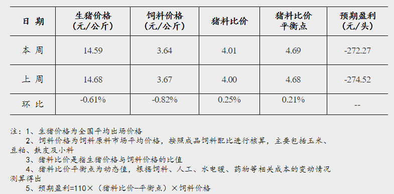新华财经北京2月10日电 据国家发展改革委价格监测中心10日公布,本周(截至2月8日当周),全国生猪出场价格为14.59元/公斤,环比下跌0.61%;饲料价格为3.64元/公斤,环比下跌0.82%。本周全国猪料比价为4.01,环比上涨0.25%。按目前价格及成本推算,未来生猪养殖头均亏损为272.27元。