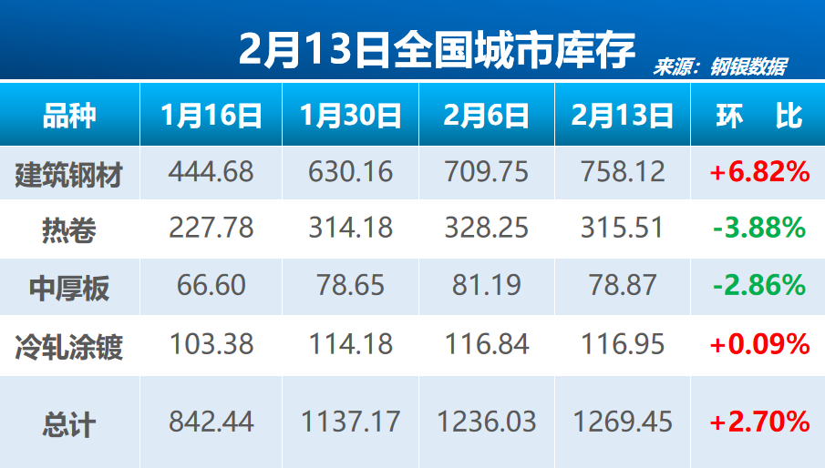 钢银电商13日公布数据显示,截至2月13日当周,全国39个城市,共计147个仓库的城市钢铁总库存量为1269.45万吨,环比增加33.42万吨,增幅2.70%。建筑钢材库存总量为758.12万吨,环比增加6.82%。