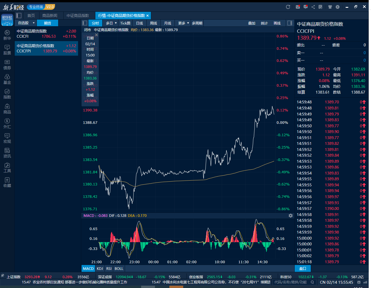 中证商品期货价格指数2月14日日内走势图