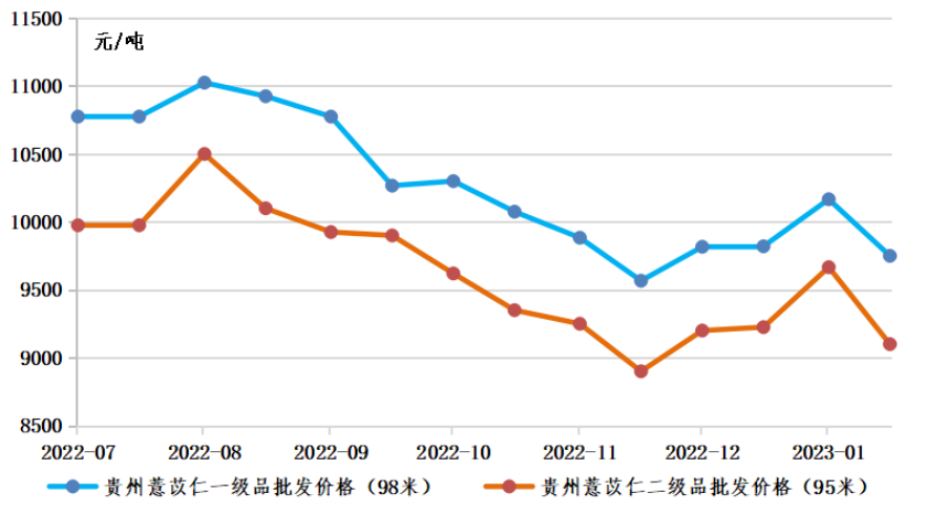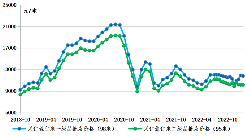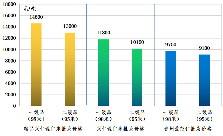 本期,精品兴仁薏仁米“98米”批发价格为14600元/吨,精品兴仁薏仁米“95米”批发价格为13000元/吨;兴仁薏仁米“98米”批发价格为11800元/吨,兴仁薏仁米“95米”批发价格为10160元/吨;贵州薏苡仁“98米”批发价格为9750元/吨,贵州薏苡仁“95米”批发价格为9100元/吨。精品薏仁米价格坚挺,其他规格品价格有所下降。