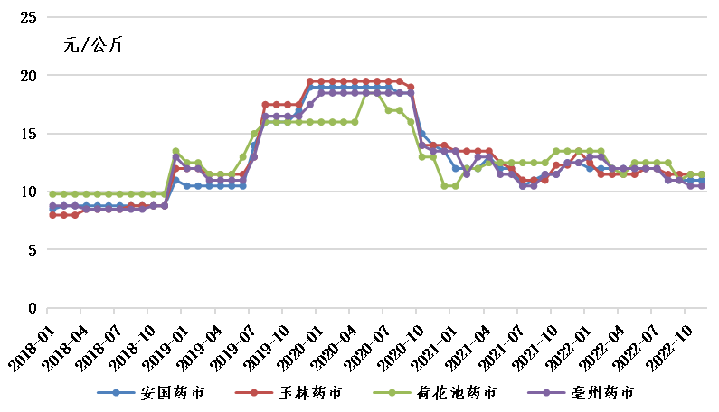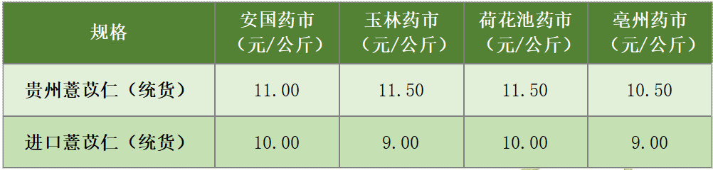 1月份,四大中药材市场薏仁米价格整体平稳。安国药市的贵州薏苡仁报11元/公斤,环比上涨0.5元/公斤,进口薏苡仁报10元/公斤,环比持平;玉林药市的贵州薏苡仁报11.5元/公斤,环比持平,进口薏苡仁报9元/公斤,环比持平;荷花池药市的贵州薏苡仁报11.5元/公斤,环比持平,进口薏苡仁报10元/公斤,环比持平;亳州药市的贵州薏苡仁报10.5元/公斤,环比持平,进口薏苡仁报9元/公斤,环比持平。