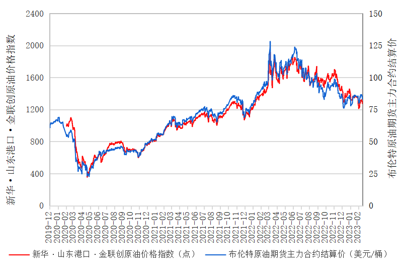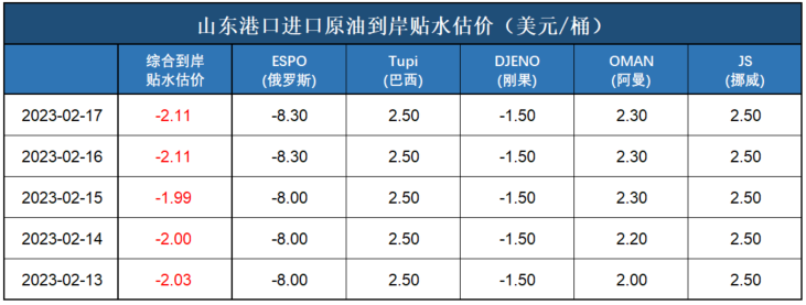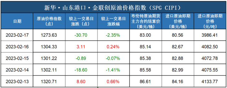 新华财经北京2月20日电(杨猛) 新华指数工业原材料研究中心数据显示,截至2023年2月17日,新华·山东港口·金联创原油价格指数(SPG CIPI)报1273.63点,较前一交易日下跌30.70点,跌幅2.35%;进口原油即期价格为80.56美元/桶,合人民币3986.41元/吨。山东港口进口原油综合到岸贴水估价为-2.11美元/桶,较前一交易日持平。