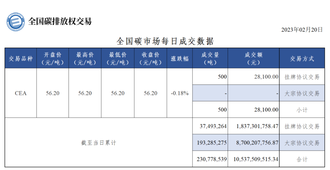2月20日全国碳市场碳排放配额(CEA)挂牌协议交易成交量500吨,成交额28,100.00元,收盘价56.20元/吨,收盘价较前一日下跌0.18%。今日无大宗协议交易。