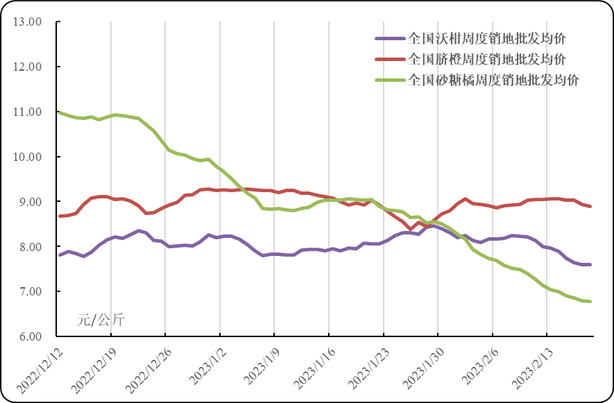 三峡库区的脐橙提前占据市场主流且含糖量同比增加,使得其在与国内竞品砂糖橘、沃柑等竞争中占据主动,近期国内脐橙市场价格坚挺且维持窄幅震荡运行。截至2月17日,全国脐橙销地批发周度均价报8.93元/公斤,环比(2月10日,下同)仅下跌1.04%,同比(2022年2月18日,下同)上涨12.95%;全国沃柑销地批发周度均价报7.60元/公斤,环比下跌7.36%,同比上涨4.64%。