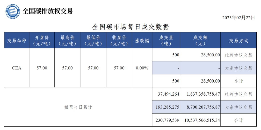 2月22日全国碳市场碳排放配额(CEA)挂牌协议交易成交量500吨,成交额28,500.00元,收盘价57.00元/吨,收盘价与前一日持平。今日无大宗协议交易。