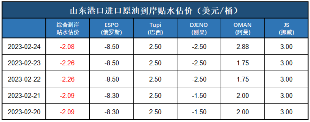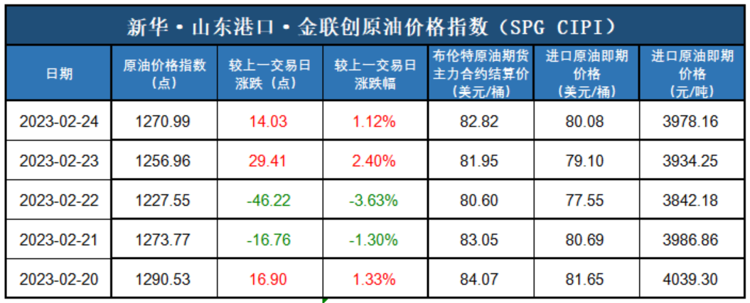 新华财经北京2月27日电(杨猛) 新华指数工业原材料研究中心数据显示,截至2023年2月24日,新华·山东港口·金联创原油价格指数(SPG CIPI)报1270.99点,较前一交易日上涨14.03点,涨幅1.12%;进口原油即期价格为80.08美元/桶,合人民币3978.16元/吨。山东港口进口原油综合到岸贴水估价为-2.08美元/桶,较前一交易日上涨0.18美元/桶,涨幅7.96%。