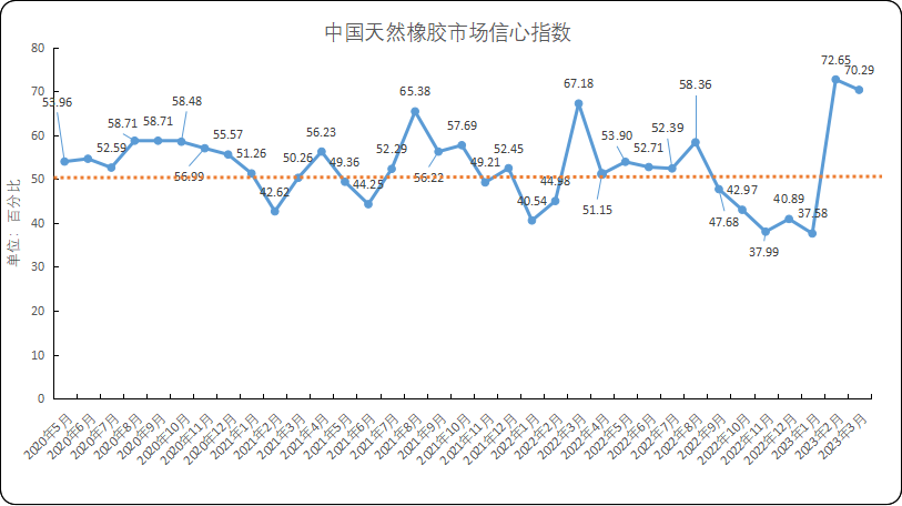 2023年3月中国天然橡胶市场信心指数(简称“NRMCI指数”)结果显示为70.29%,较上月减少2.36个百分点,高于50%临界点。
