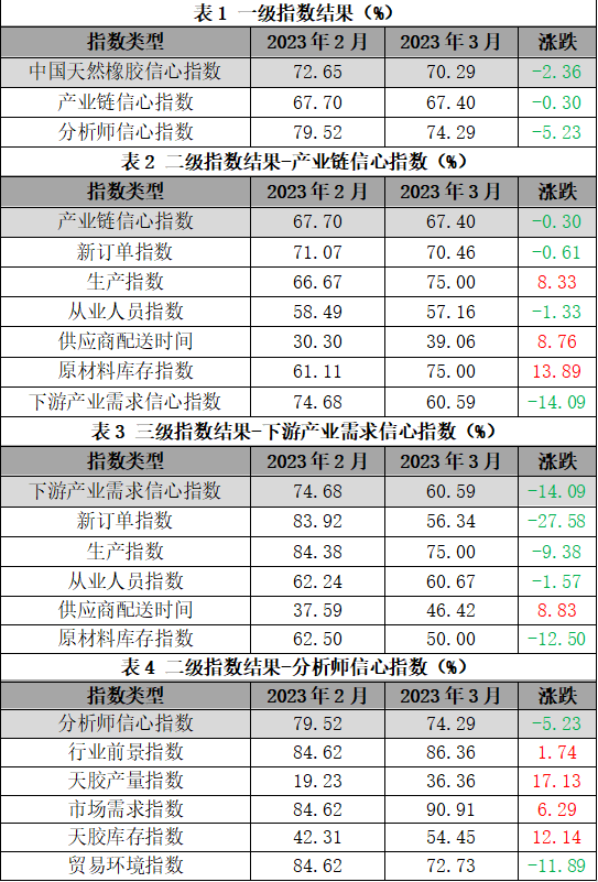 表1 2023年2月-2023年3月中国天然橡胶市场信心指数(NRMCI)运行情况