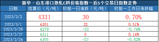 截至2023年3月2日,新华·山东港口热轧C料价格指数报4331元/吨,较前一交易日上涨30元/吨,涨幅0.70%。