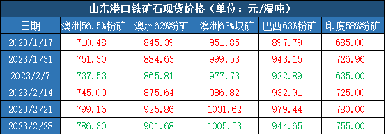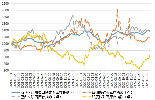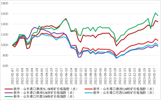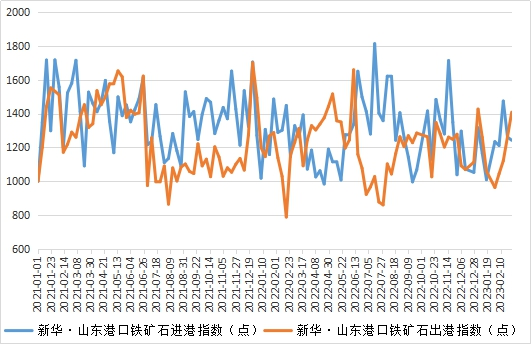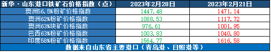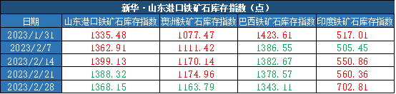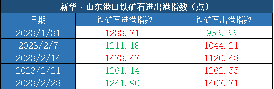 截至2月28日,新华·山东港口铁矿石进港指数报1241.90点,较2月21日下跌19.24点,跌幅1.53%;新华·山东港口铁矿石出港指数报1407.71点,较2月21日上涨145.16点,涨幅11.50%。