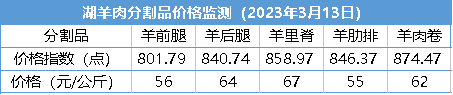 截至3月12日,与上期相比,各湖羊肉分割品中两种产品价格上涨。