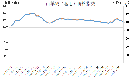 截至3月12日,山羊绒(套毛)价格指数报1175.66点,较上期下跌1.53%,山羊绒(套毛)价格报102.4元/斤,较上期下跌1.6元/斤。