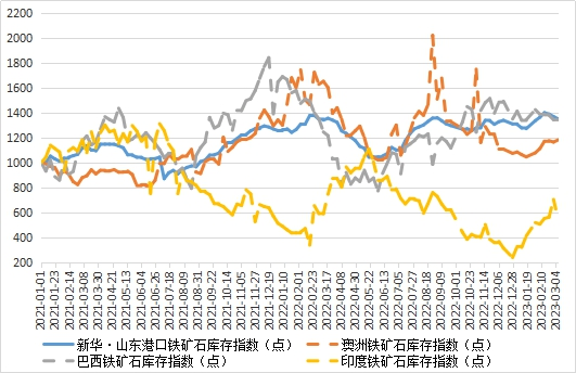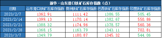 截至3月7日,新华·山东港口铁矿石库存指数报1349.79点,较2月28日下跌18.36点,跌幅1.34%。