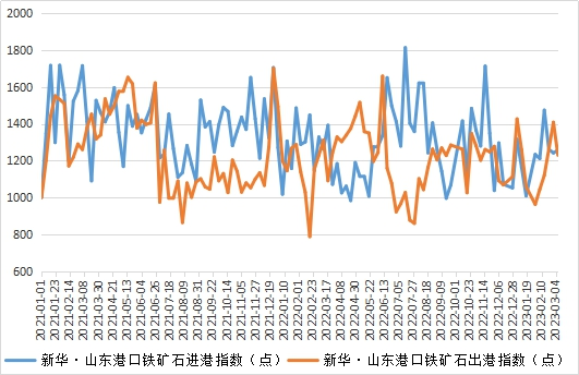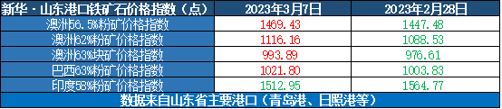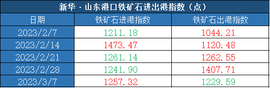截至3月7日,新华·山东港口铁矿石进港指数报1257.32点,较2月28日上涨15.42点,涨幅1.24%;新华·山东港口铁矿石出港指数报1229.59点,较2月28日下跌178.12点,跌幅12.65%。