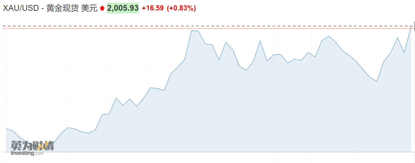 避险情绪的助涨下,北京时间周一午后,现货黄金自2022年3月来首次站上2000美元/盎司大关。