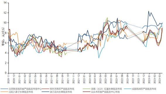 从具体脐橙批发市场表现来看,本期新华指数农业市场研究中心重点监测的七大批发市场中,成都雨润农产品批发市场脐橙销售价格最高,脐橙批发均价为10元/公斤;沈阳八家子水果批发市场脐橙销售价格最低,脐橙批发均价为8.13元/公斤。