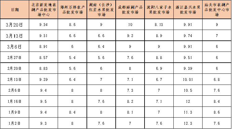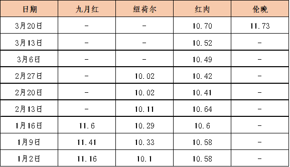 在脐橙产地收购方面,秭归中熟脐橙品种——纽荷尔脐橙仅剩零星交易,即将下市,晚熟脐橙品种——秭归伦晚陆续成熟,开始大批量上市,本期伦晚收购量较上期环比上涨11.67%。价格方面,截至3月20日,秭归伦晚脐橙产地收购均价报7.21元/公斤,环比上涨8.91%;秭归红肉脐橙产地收购均价报5.24元/公斤,环比下跌1.86%。