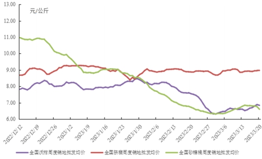 截至3月20日,全国脐橙销地批发周度均价为8.94元/公斤,环比(3月13日,下同)上涨0.9%,同比(2022年3月18日,下同)上涨12.10%;全国沃柑销地批发周度均价为6.84元/公斤,环比上涨3.64%,同比上涨6.28%;全国砂糖橘销地批发周度均价为6.60元/公斤,环比下跌2.68%,同比上涨15.61%。