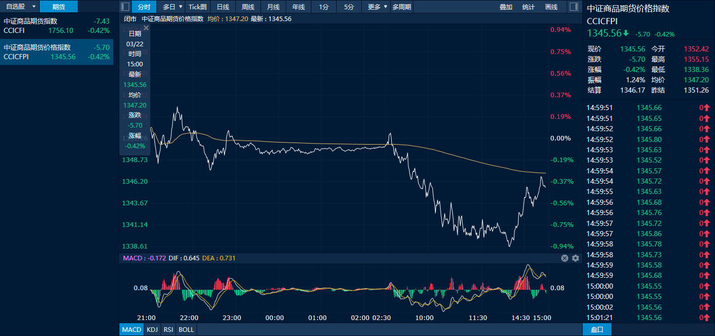 中证商品期货价格指数3月22日日内走势图 来源:新华财经专业终端