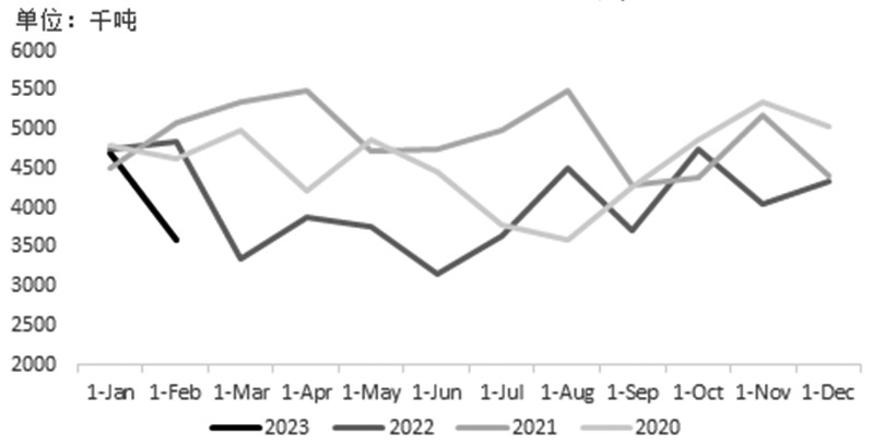 2月5日欧盟对俄罗斯成品油实施禁运以及价格上限,柴油等昂贵的精炼产品价格上限为100美元/桶,燃料油等折价产品上限为45美元/桶,欧盟后续会进行调整。3月至6月俄罗斯宣布减产原油50万桶/日,乌拉尔原油产量预期下降,乌拉尔原油作为中质含硫原油,该品质原油产量的下降,间接减少高硫燃料油产出,从而对高硫燃料油价格有所支撑。此外,由于有价值的成品油与低价值副产品价差较大,俄罗斯预计最大程度生产有价值的成品油,降低廉价副产品。根据船期数据来看,2月俄罗斯燃料油出口量大幅下降,对高硫燃料油形成支撑。