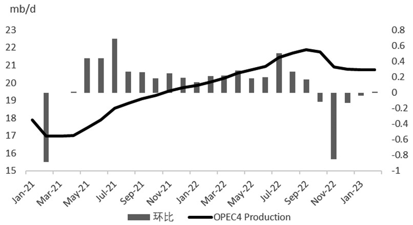 OPEC+于去年11月减产200万桶/日,主要减产对象为中东四国,即沙特、阿联酋、科威特以及伊拉克。算上伊朗、委内瑞拉与俄罗斯,OPEC+七国产量(涉及原油品质主要为中重质含硫原油,简单加工下高硫出率偏高)从2022年10月的3471万桶/日下降至2023年2月的3332万桶/日。