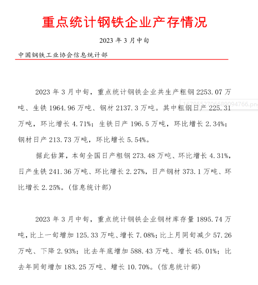 2023年3月中旬,重点统计钢铁企业共生产粗钢2253.07万吨、生铁1964.96万吨、钢材2137.3万吨。重点统计钢铁企业钢材库存量1895.74万吨,比上一旬增加125.33万吨、增长7.08%。