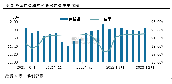 截至2月底,全国产蛋鸡存栏量约为11.85亿只,环比增幅仅为0.68%,较近五年均值低2.39%。近三年养殖单位补栏积极性均不高,今年春节前期养殖单位多集中淘汰老鸡,使得存栏量进一步减少。部分省份存栏蛋鸡受疾病影响,产蛋率降低3-10个百分点,个别超过10个百分点,截至3月中旬,全国平均高峰期蛋鸡产蛋率92.17%,略低于正常水平。存栏量、产蛋率均不高,使得鸡蛋产量有限。