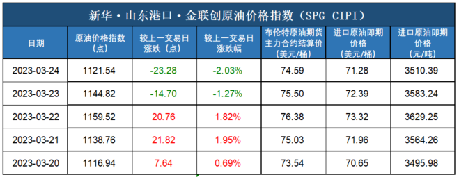 新华财经北京3月27日电(杨猛) 新华指数工业原材料研究中心数据显示,截至2023年3月24日,新华·山东港口·金联创原油价格指数(SPG CIPI)报1121.54点,较前一交易日下跌23.28点,跌幅2.03%;进口原油即期价格为71.28美元/桶,合人民币3510.39元/吨。山东港口进口原油综合到岸贴水估价为-0.75美元/桶,较前一交易日持平。