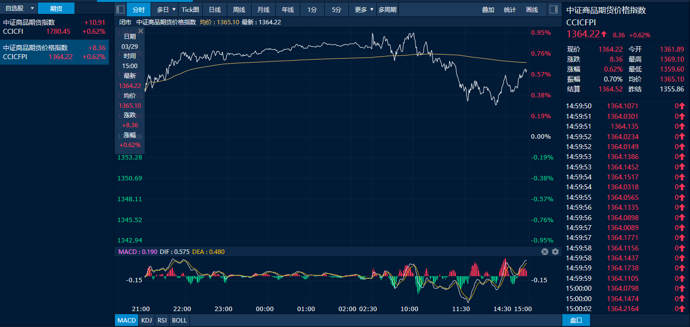 国内商品期货市场3月29日涨多跌少。截至下午收盘,追踪国内商品市场的中证商品期货价格指数收报1364.22点,较前一交易日上涨0.62%;中证商品期货指数收报1780.45点,较前一交易日上涨0.62%。
