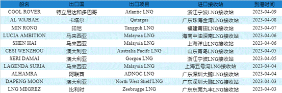 表2:4月3日-4月9日中国LNG进口预测