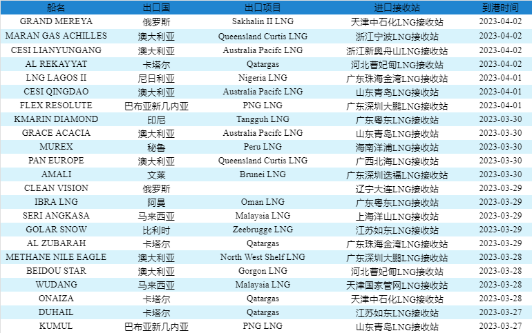 表1:3月27日-4月2日中国LNG进口分析