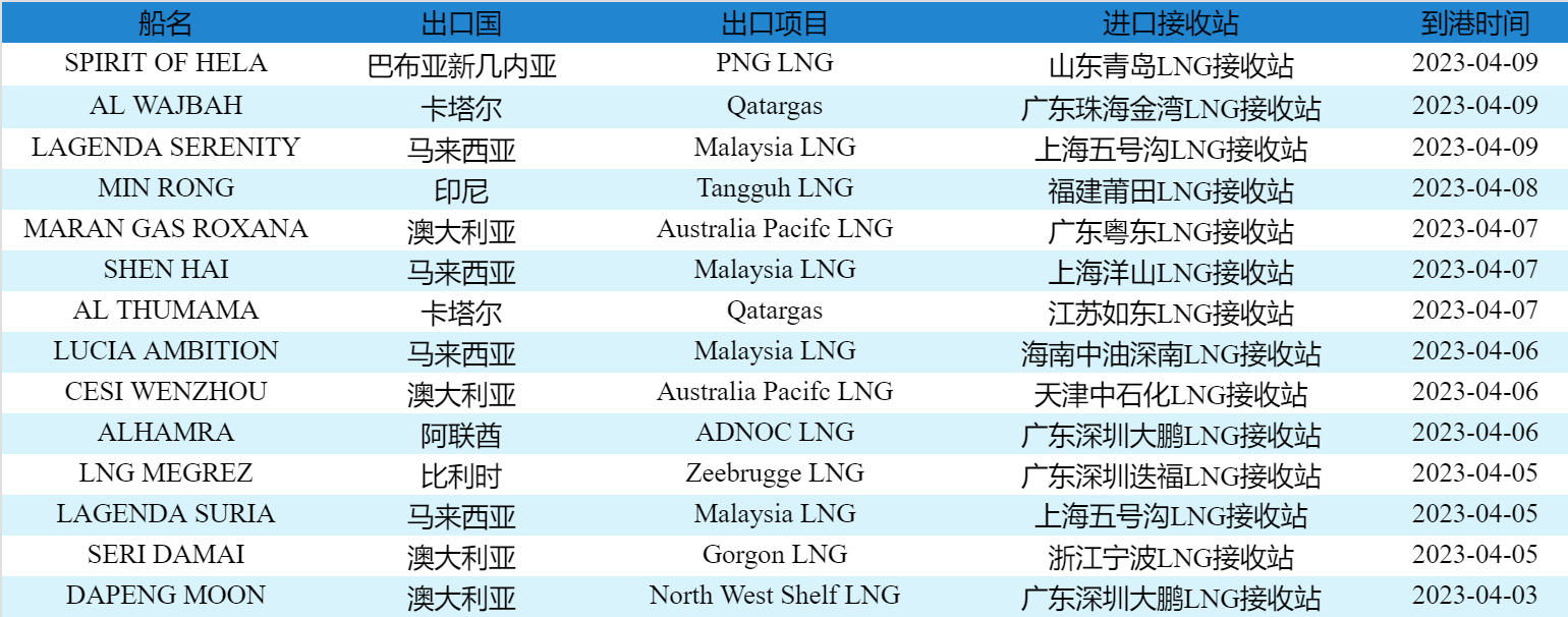 从到货地看,4月3日-4月9日当周,华南地区共接卸7船LNG,长三角地区接卸5船,环渤海地区接卸2船。其中,深圳大鹏LNG站到港2船,共计约12万吨,数量最多。