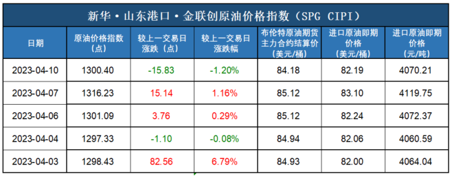 新华财经北京4月11日电(杨猛) 新华指数工业原材料研究中心数据显示,截至2023年4月10日,新华·山东港口·金联创原油价格指数(SPG CIPI)报1300.40点,较前一交易日下跌15.83点,跌幅1.20%;进口原油即期价格为82.19美元/桶,合人民币4070.21元/吨。山东港口进口原油综合到岸贴水估价为-0.29美元/桶,较前一交易日上涨0.01美元/桶,涨幅3.33%。