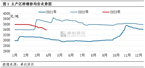 从特精粉价格走势来看,据卓创资讯数据监测,3月主产区特精粉均价为3460元/吨,较上月下降2.98%,主要原因是原粮小麦价格走低,厂家原粮成本下降,挺价意愿松动,竞争降价走货;同时,面粉经销商看空后市,拿货不积极,下游需求平淡。